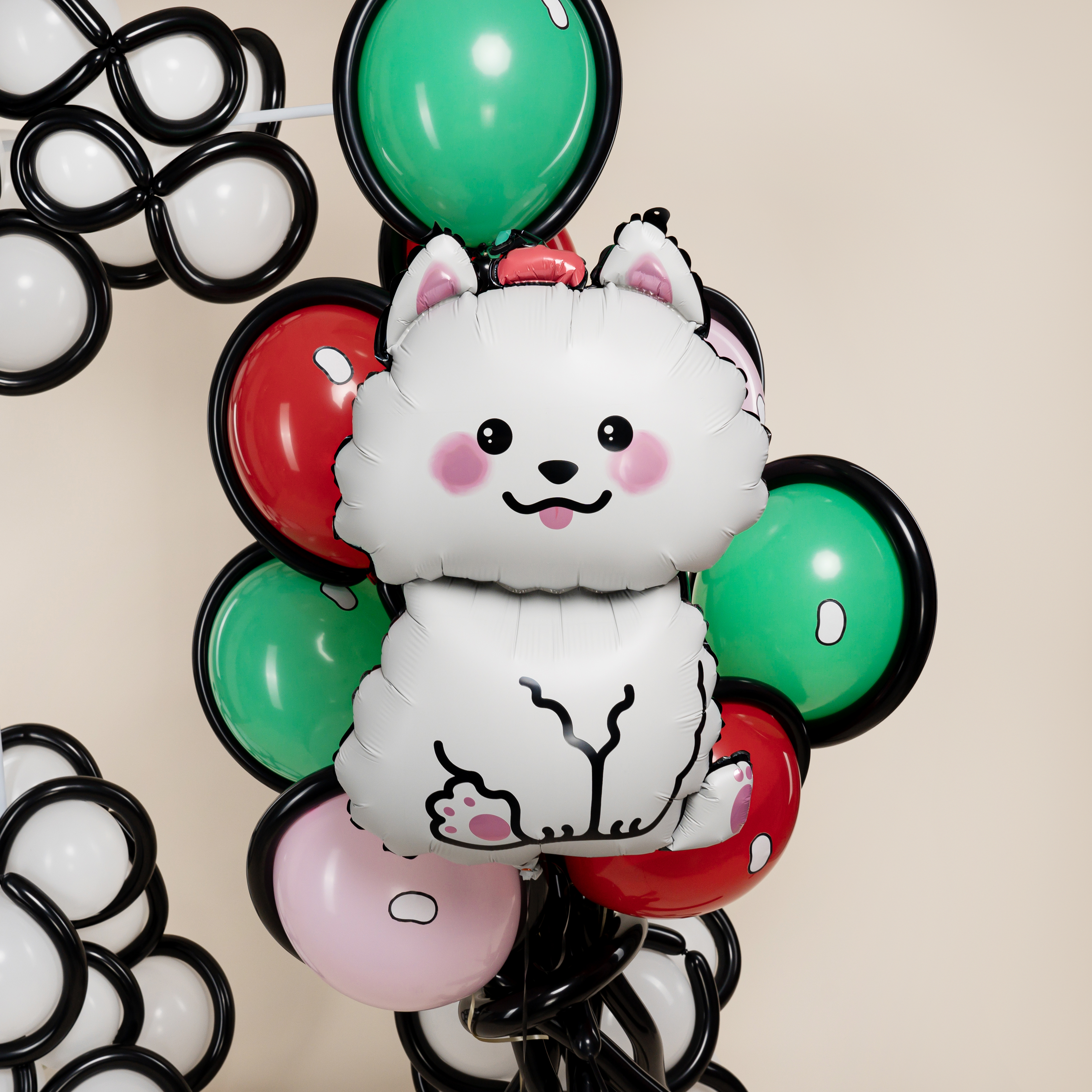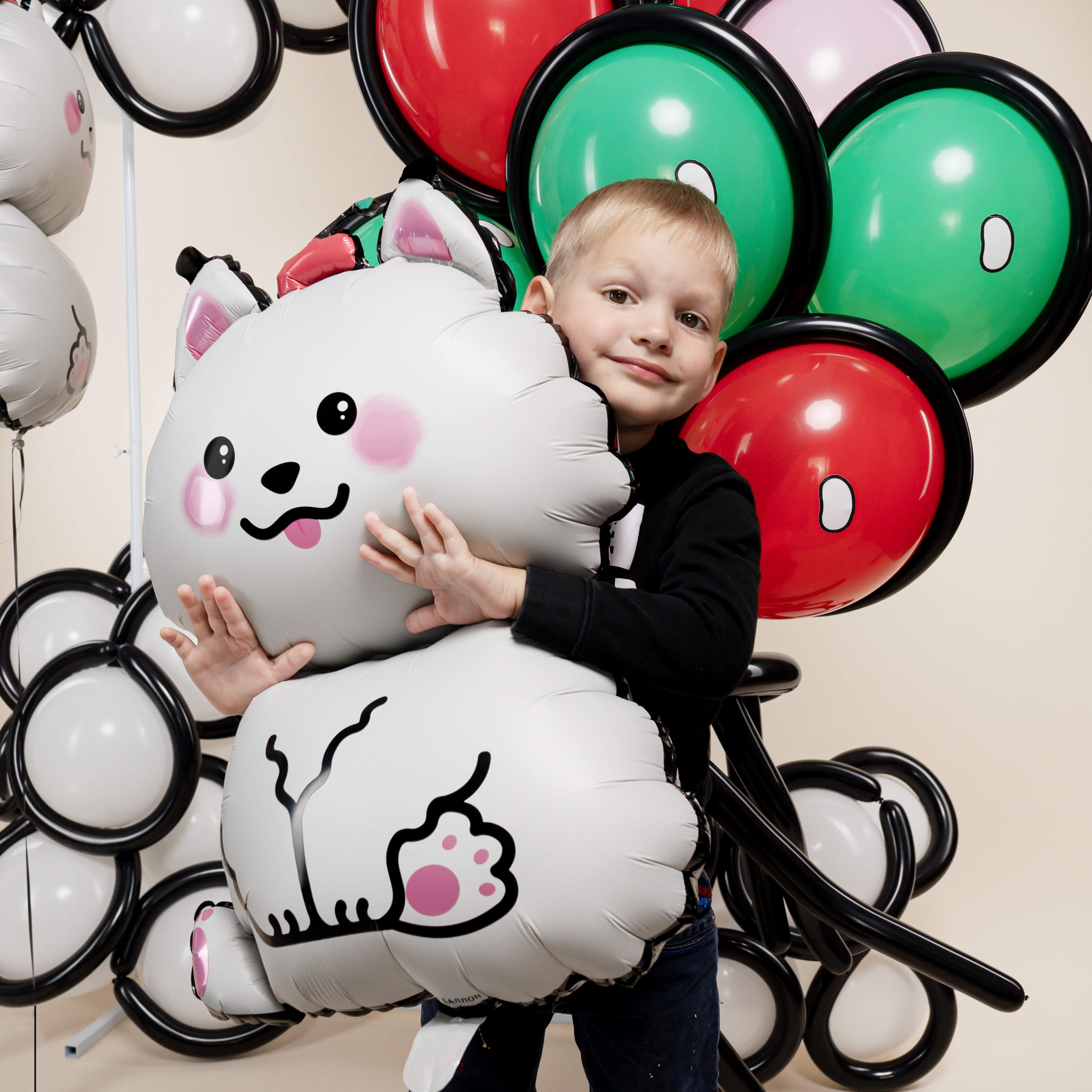 Стильная фотозона с милым щенком и графичной воздушной обводкой из шаров для моделирования создаёт атмосферу современного детского праздника. Контрастные формы, яркие акценты и необычная подача делают фотосессию эффектной, модной и эмоциональной.