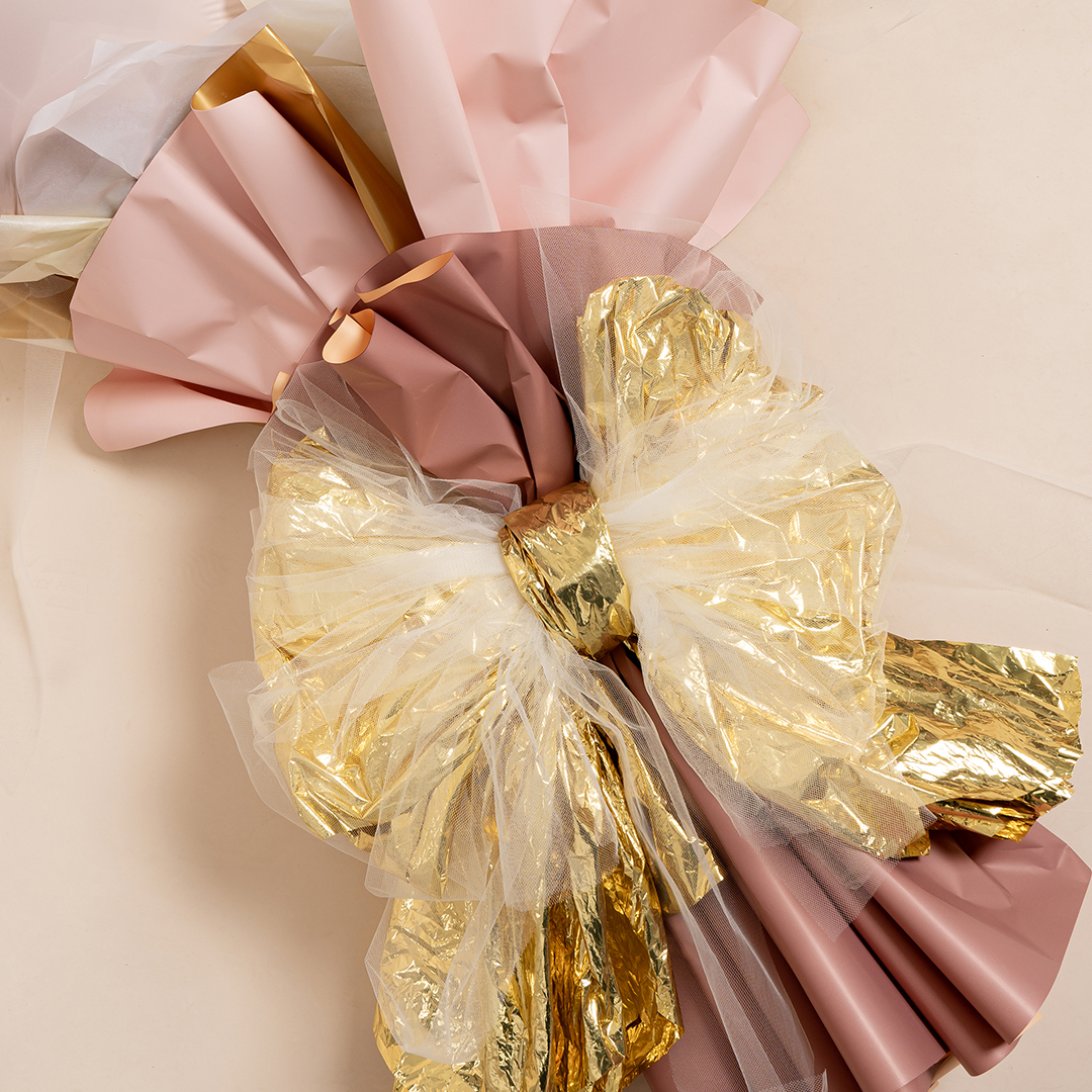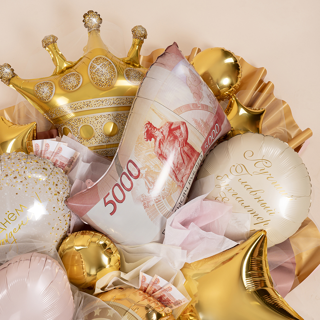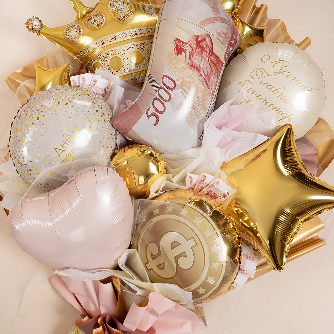 Роскошный букет из фольгированных шаров в золотисто-розовой гамме создаёт атмосферу настоящего праздника и яркого торжества. Великолепная корона, купюра, золотые звёзды и нежное сердце формируют эффектную композицию с нотками гламура и успеха. Благородное сочетание золота, пудрового и кремового оттенков придаёт оформлению изысканность, а объёмная упаковка с декоративным бантом из полисилка делает букет по-настоящему впечатляющим.