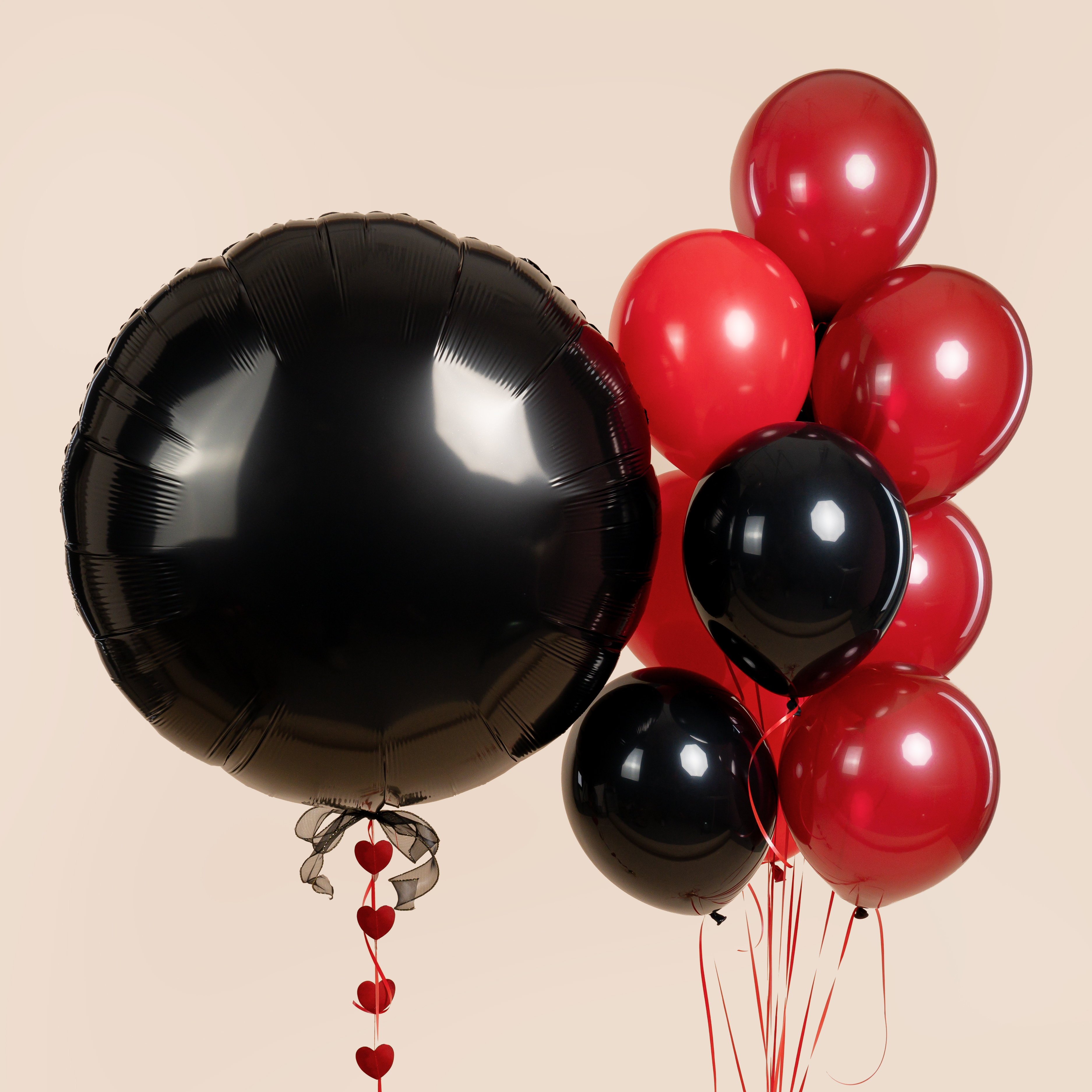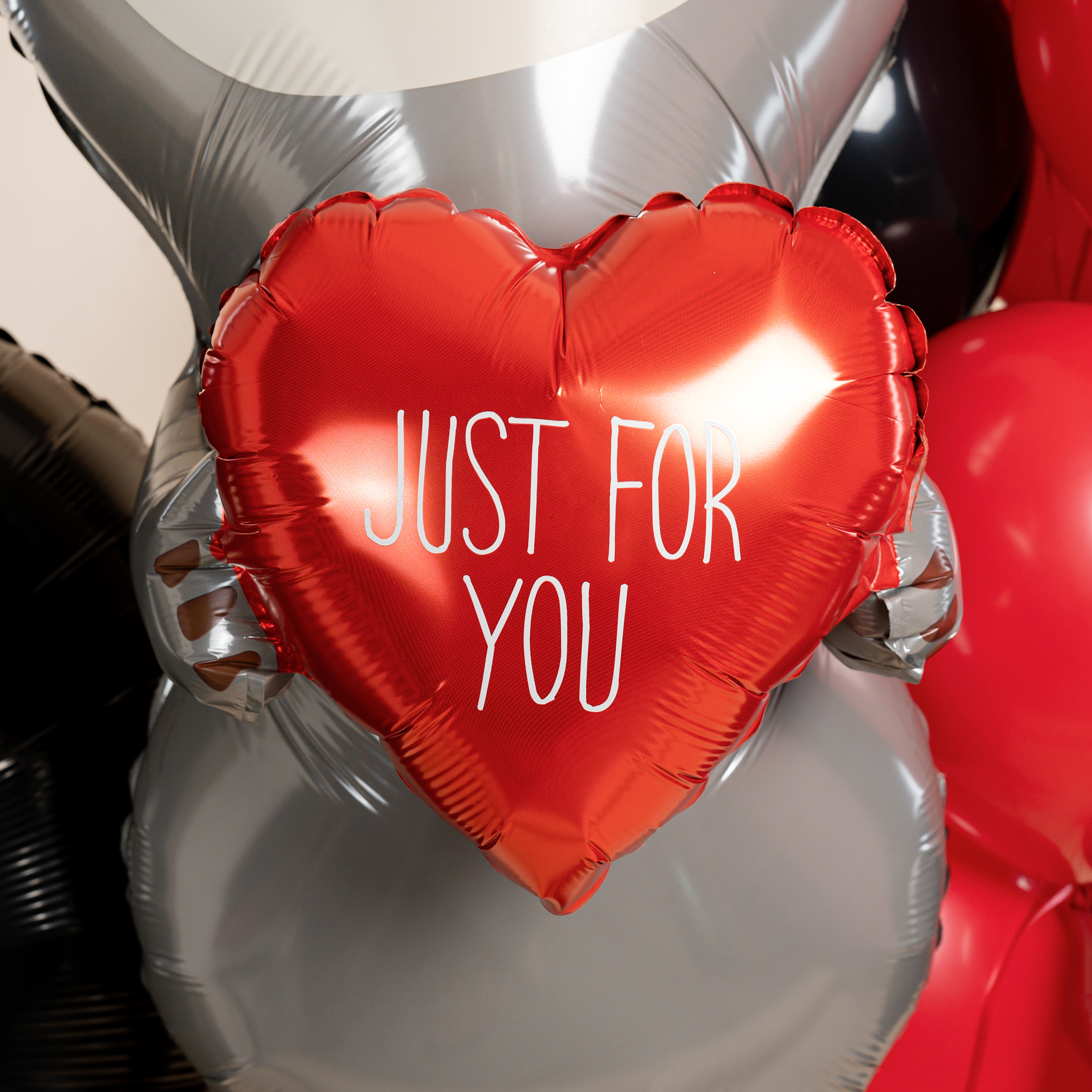 Оригинальная фотозона с милым персонажем создаёт атмосферу стильной романтики. Контраст чёрных и красных оттенков, лаконичный декор и выразительный образ делают фотосессию современной, эффектной и эмоциональной.