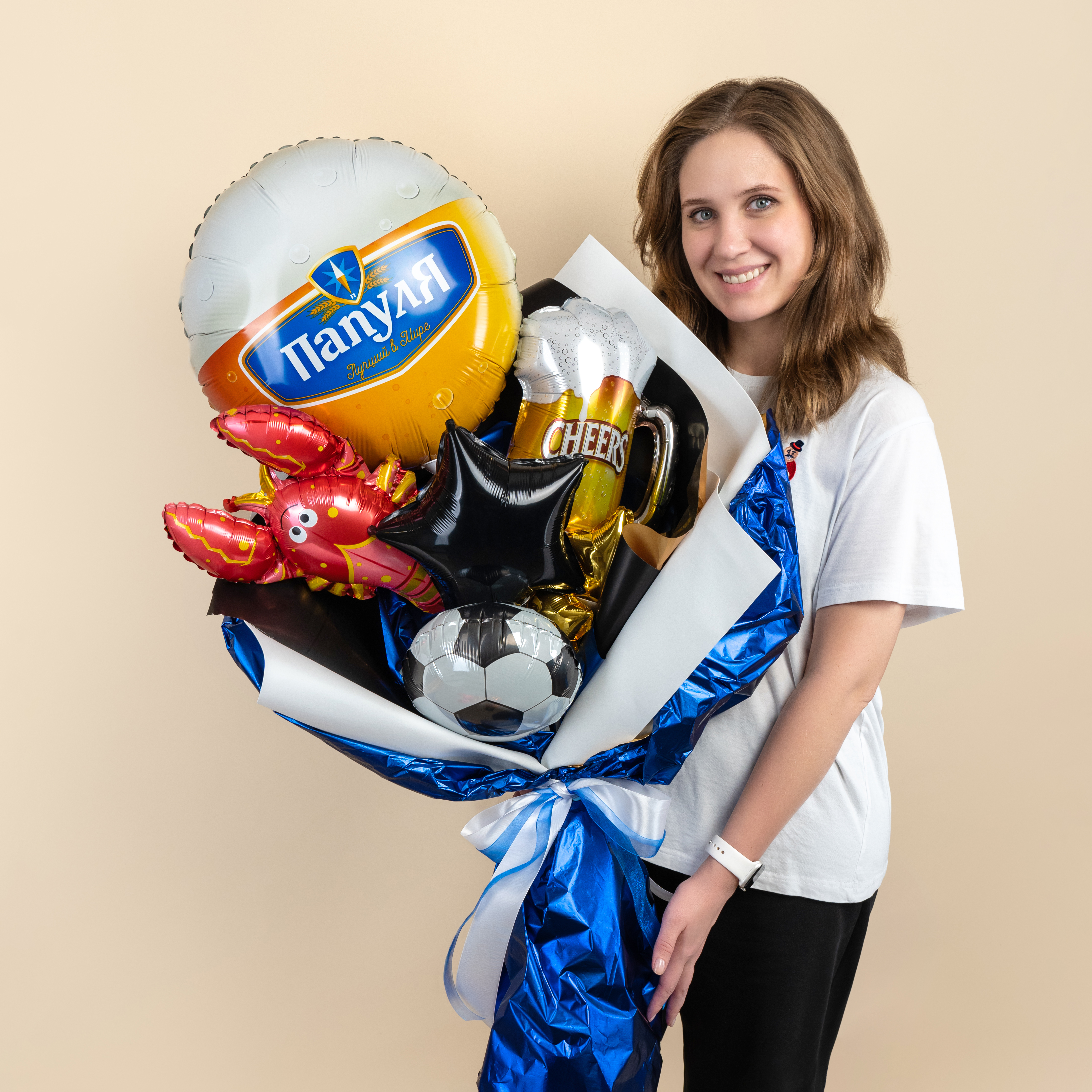 Стильный праздничный букет из фольгированных шаров станет оригинальным подарком для настоящего мужчины и создаст атмосферу яркого праздника. Центральный шар с надписью, эффектная кружка пива, красный рак, футбольный мяч и чёрная звезда формируют выразительную композицию с характером.