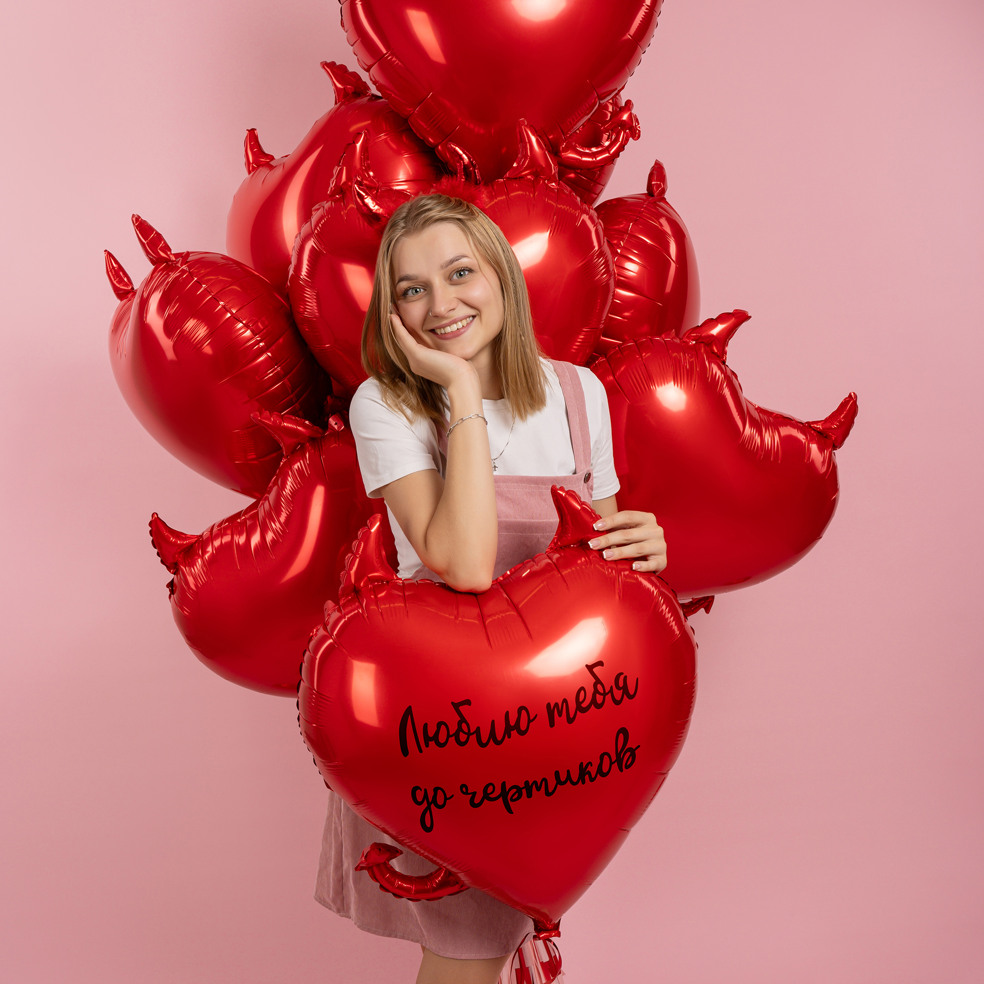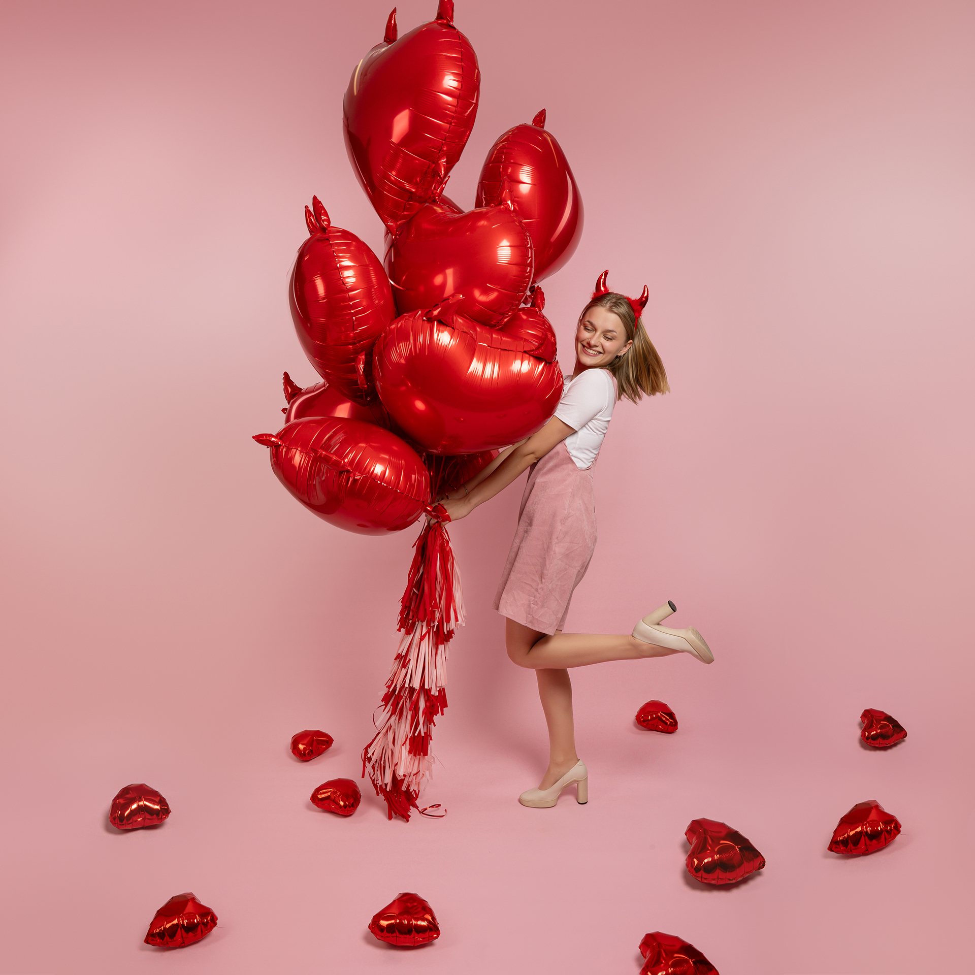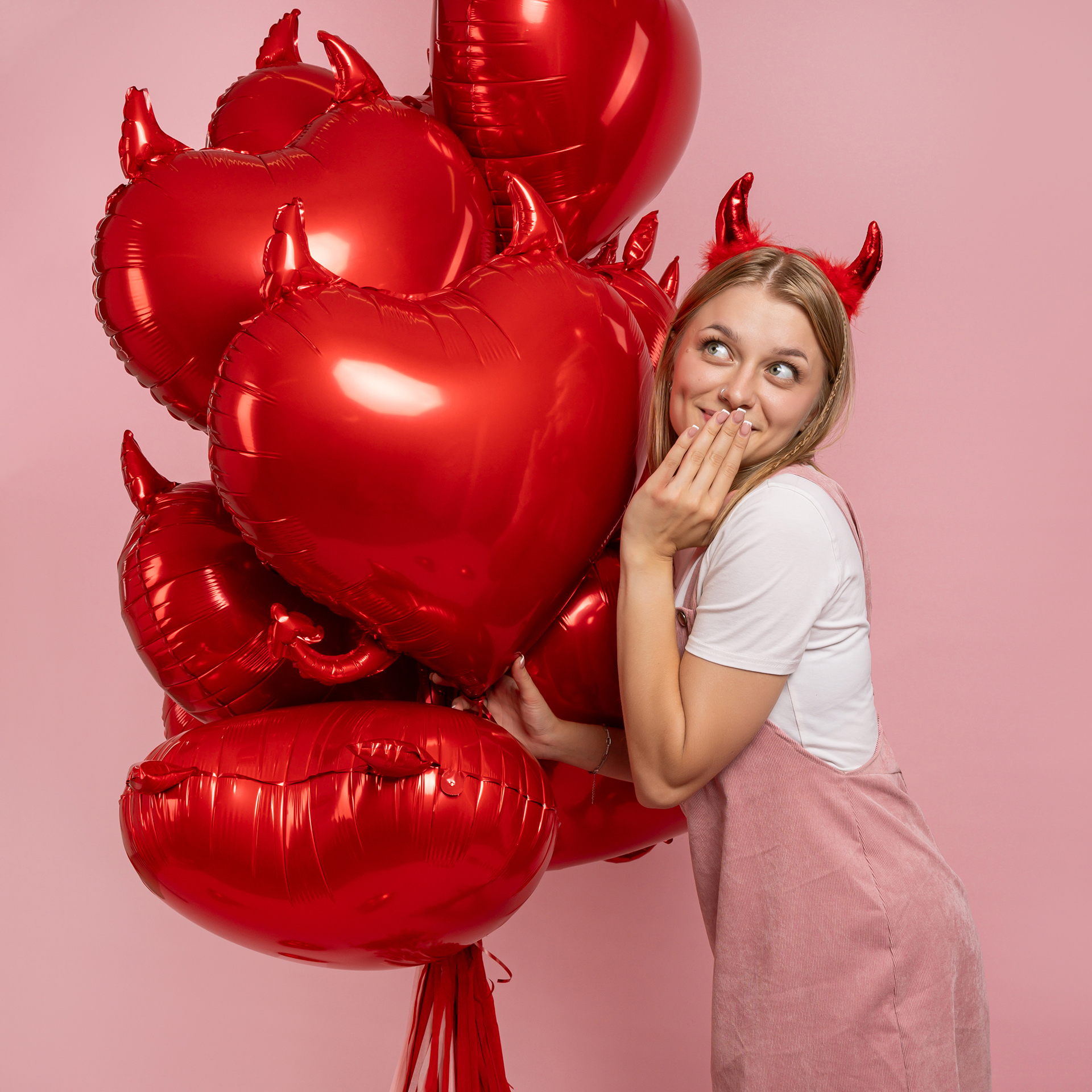 Яркая фотозона с сердцами в образе чертёнка создаёт атмосферу дерзкой романтики и эффектного праздника. Глянцевые красные оттенки и игривые детали делают фотосессию смелой, выразительной и запоминающейся.