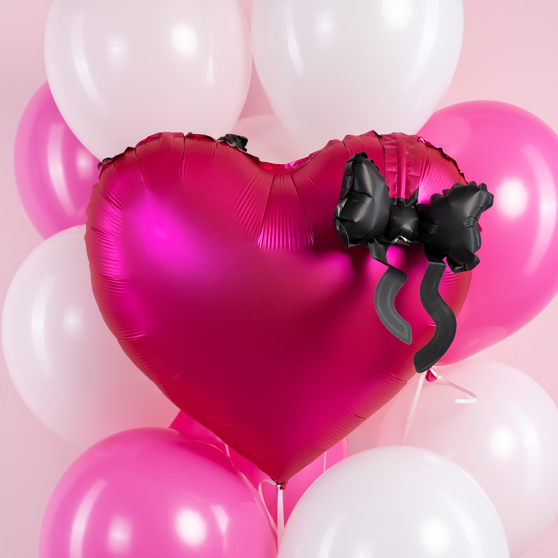 Стильный фонтан с сердцем цвета фуше и контрастным чёрным бантом создаёт атмосферу яркого гламура и современной элегантности. Сочетание насыщенного розового оттенка с лаконичными акцентами делает фотосессию выразительной, модной и эмоциональной.