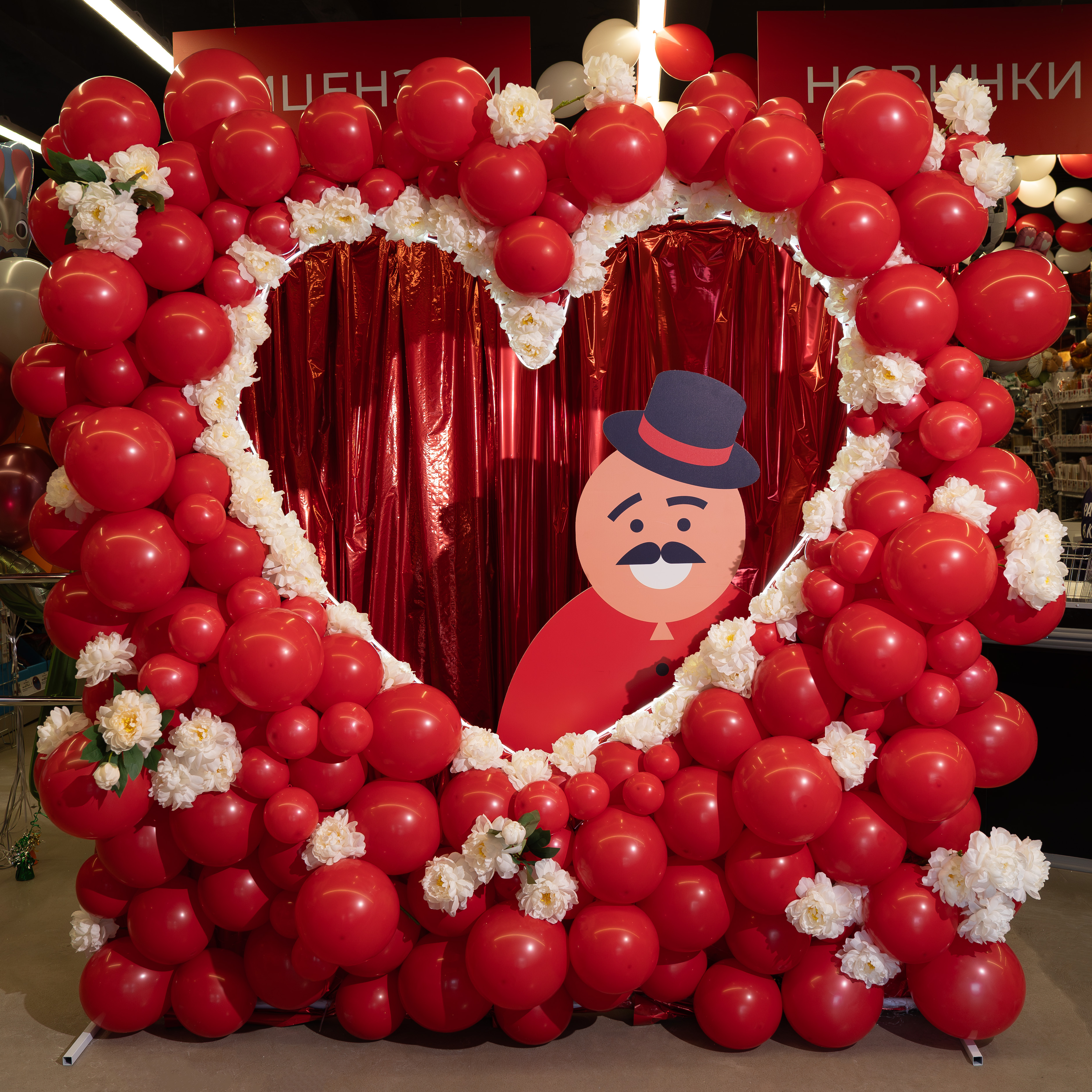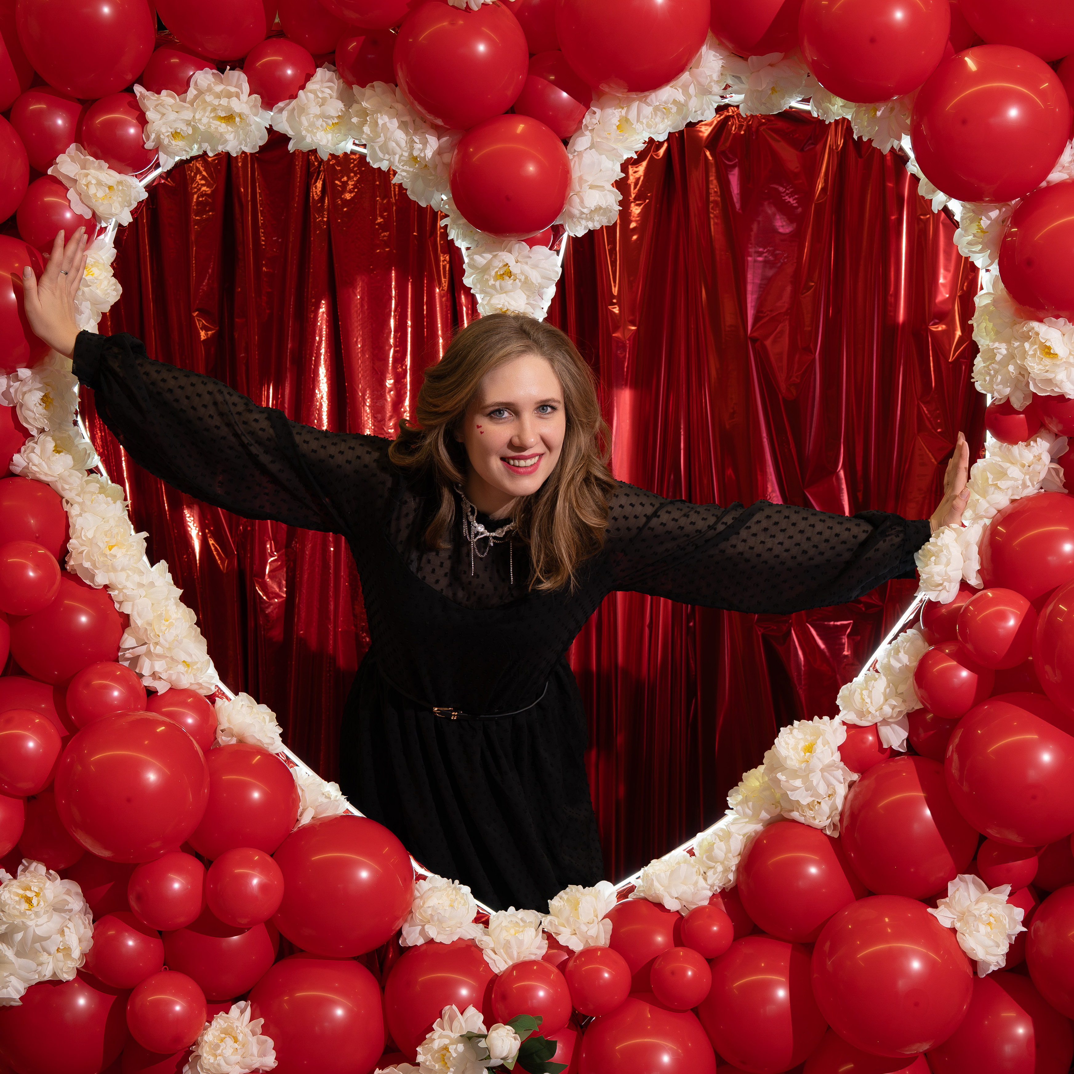 Роскошная фотозона в насыщенной красной гамме создаёт атмосферу страсти, торжественности и эффектного праздника. Объёмное сердце, украшенное нежными пионами, выглядит ярко и создаёт атмосферу романтики, роскоши и торжественности.