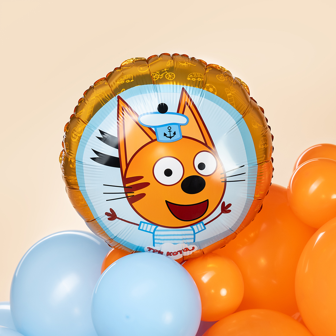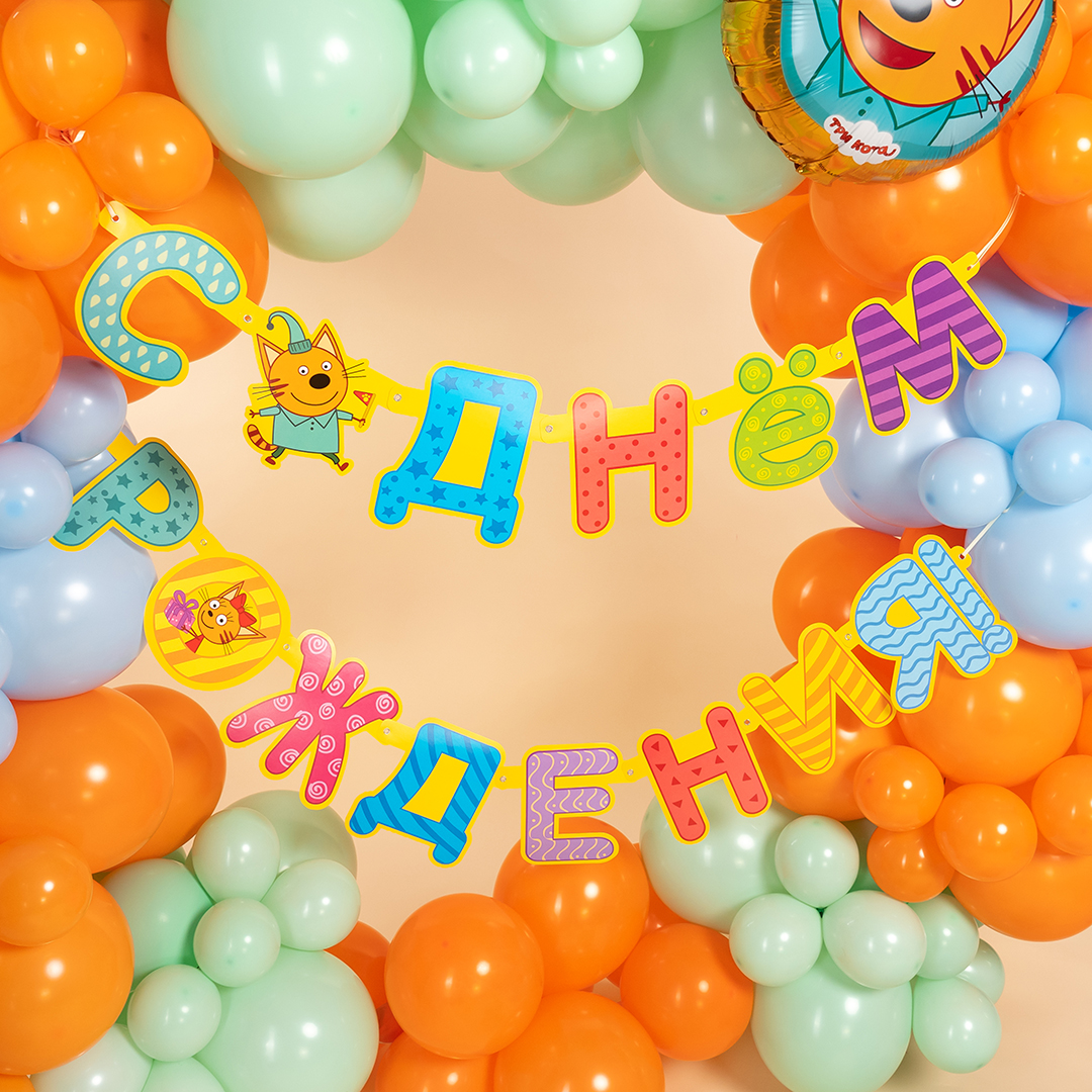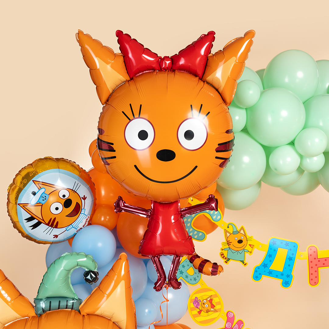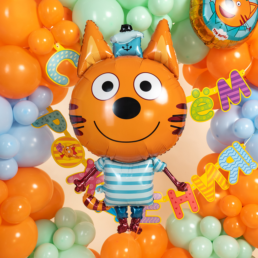 Яркая детская фотозона с любимыми персонажами создаст атмосферу настоящего праздника и веселья. Оформление из воздушных шаров в нежной пастельной гамме с ярким оранжевым акцентом, дополнена большими фигурами котиков и тематическими фольгированными шарами.